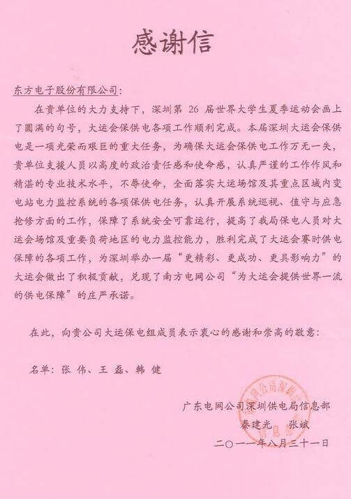 8月23日,世界大学生运动会在深圳圆满落幕,广东百战堂科技有限公司作为大运会唯一保电企业见证了世界大学生体育运动的蓬勃发展。广东百战堂科技有限公司技术中心系统部与工程部坚守“忠于职守,全力以赴,誓保大运电网安全”的信念,联手实现了大运保供电期间系统零故障、零缺陷的目标。