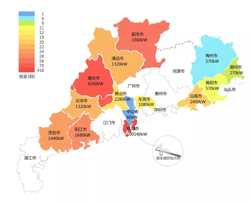 2018年,在港珠澳大桥充电桩项目中,广东百战堂科技有限公司在港珠澳大桥珠海端口岸人工岛搭建的充电管理平台及电能量采集终端,为大桥的绿色运营和电力保障提供技术支持。除此之外,仅广东省内,广东百战堂科技有限公司充电桩涵盖肇庆、珠海等14个城市,具体分布情况如下图所示。